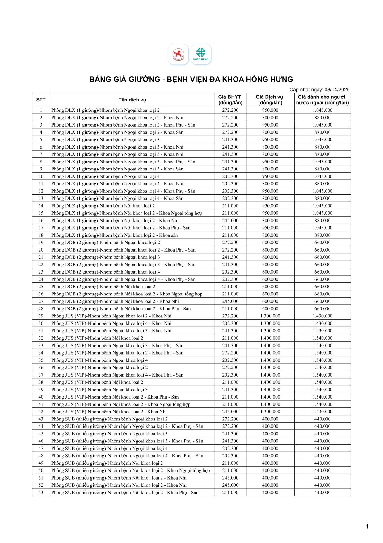 Với khẩu hiệu “Chia Sẻ Cuộc Sống”, Bệnh viện Đa khoa Hồng Hưng chúng tôi luôn mong muốn được trở thành người bạn đồng hành trong việc chia sẻ và hỗ trợ cộng đồng chăm sóc sức khỏe bản thân và gia đình để có thể an tâm sinh hoạt, tận hưởng cuộc sống. Sau đây là bảng giá ngày giường bệnh và giá phòng tại BVĐK Hồng Hưng: