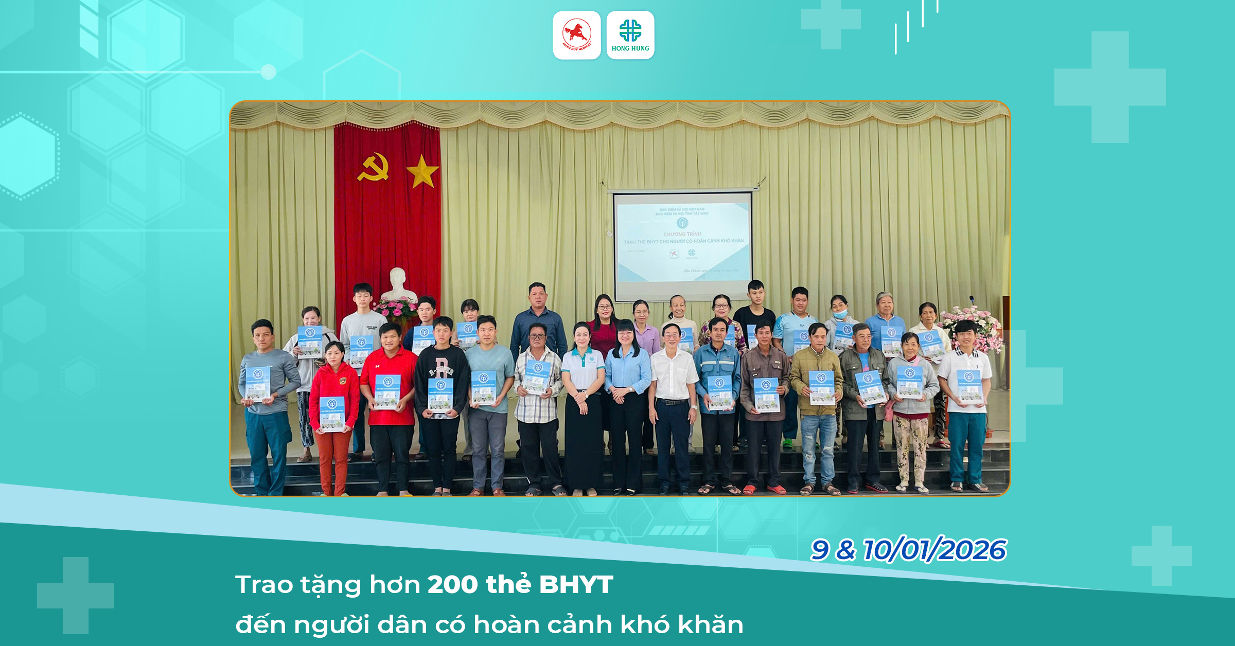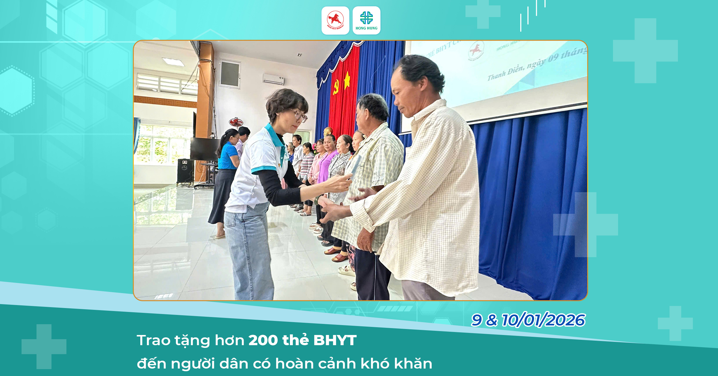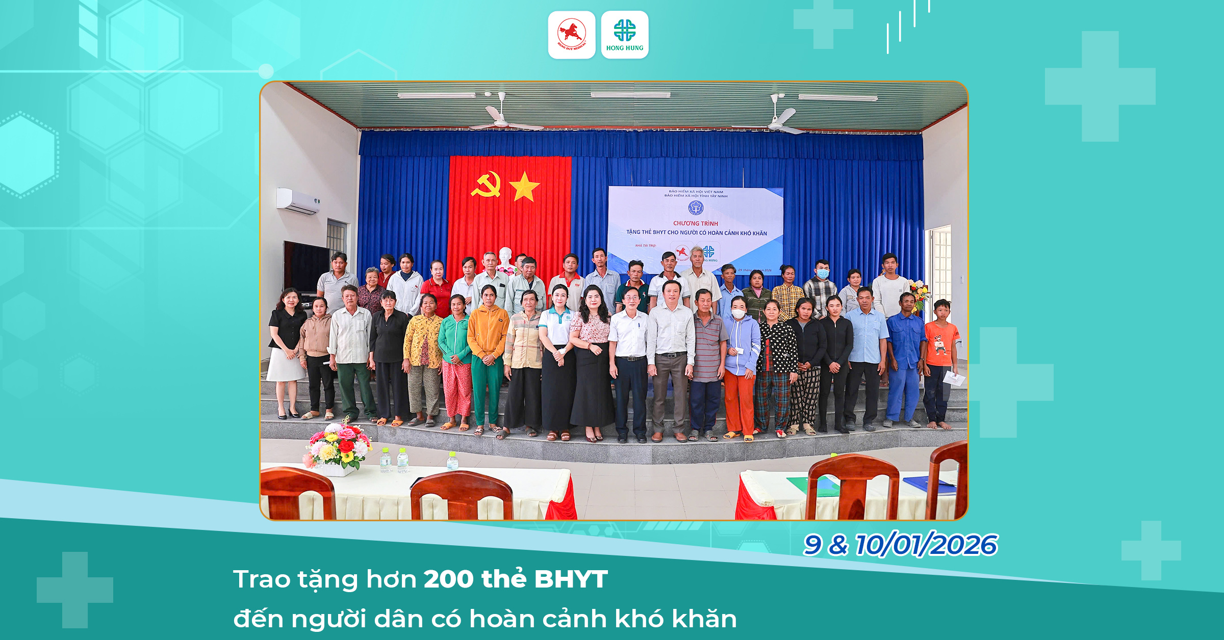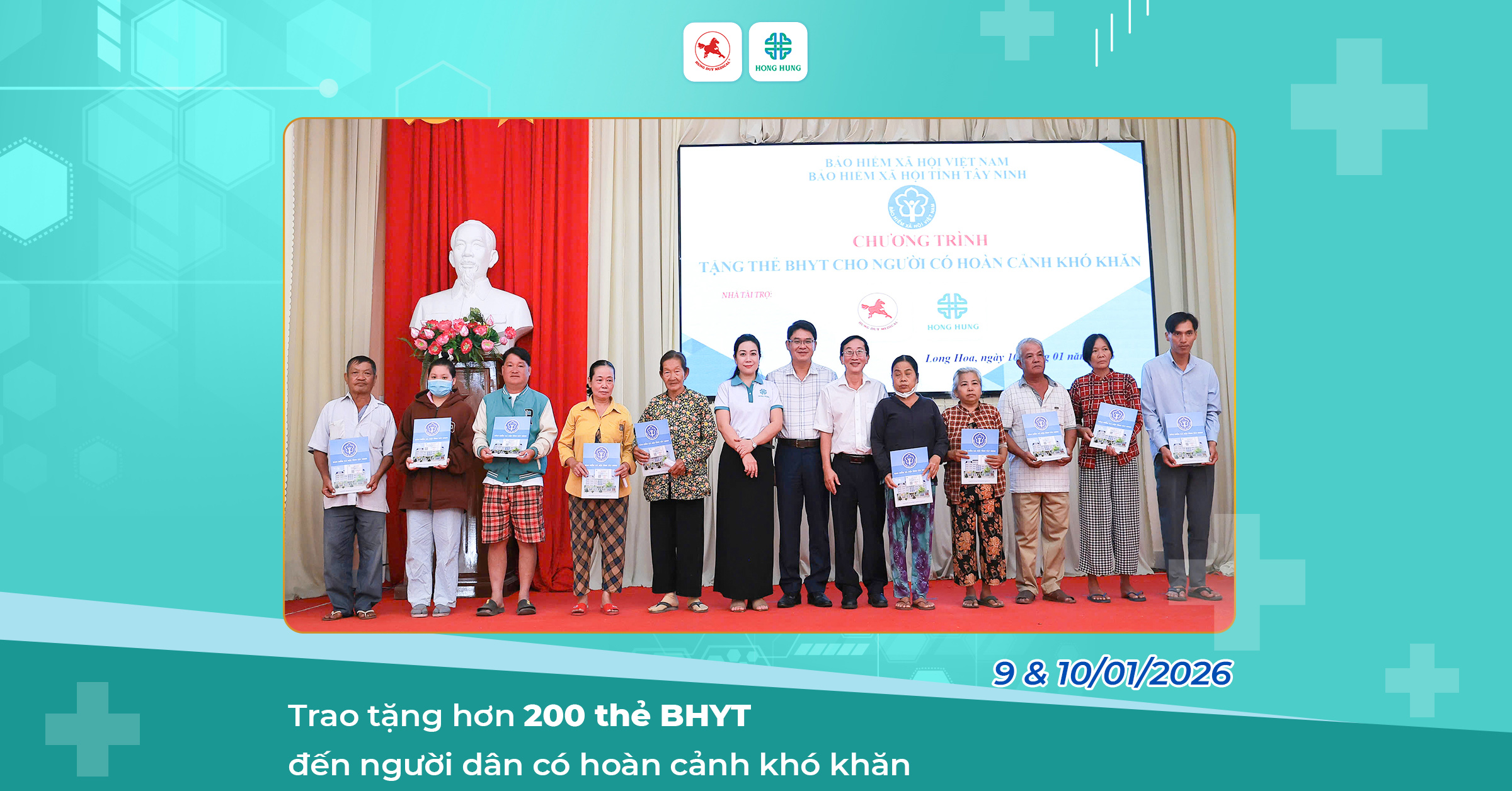 Trong hai ngày 09 và 10/01/2026 vừa qua, Bệnh viện Đa khoa Hồng Hưng đã tổ chức trao tặng 239 thẻ Bảo hiểm Y tế (BHYT) với thời hạn sử dụng 06 tháng đến người dân có hoàn cảnh khó khăn tại xã Hòa Hội, phường Thanh Điền, phường Long Hoa và phường Hòa Thành.