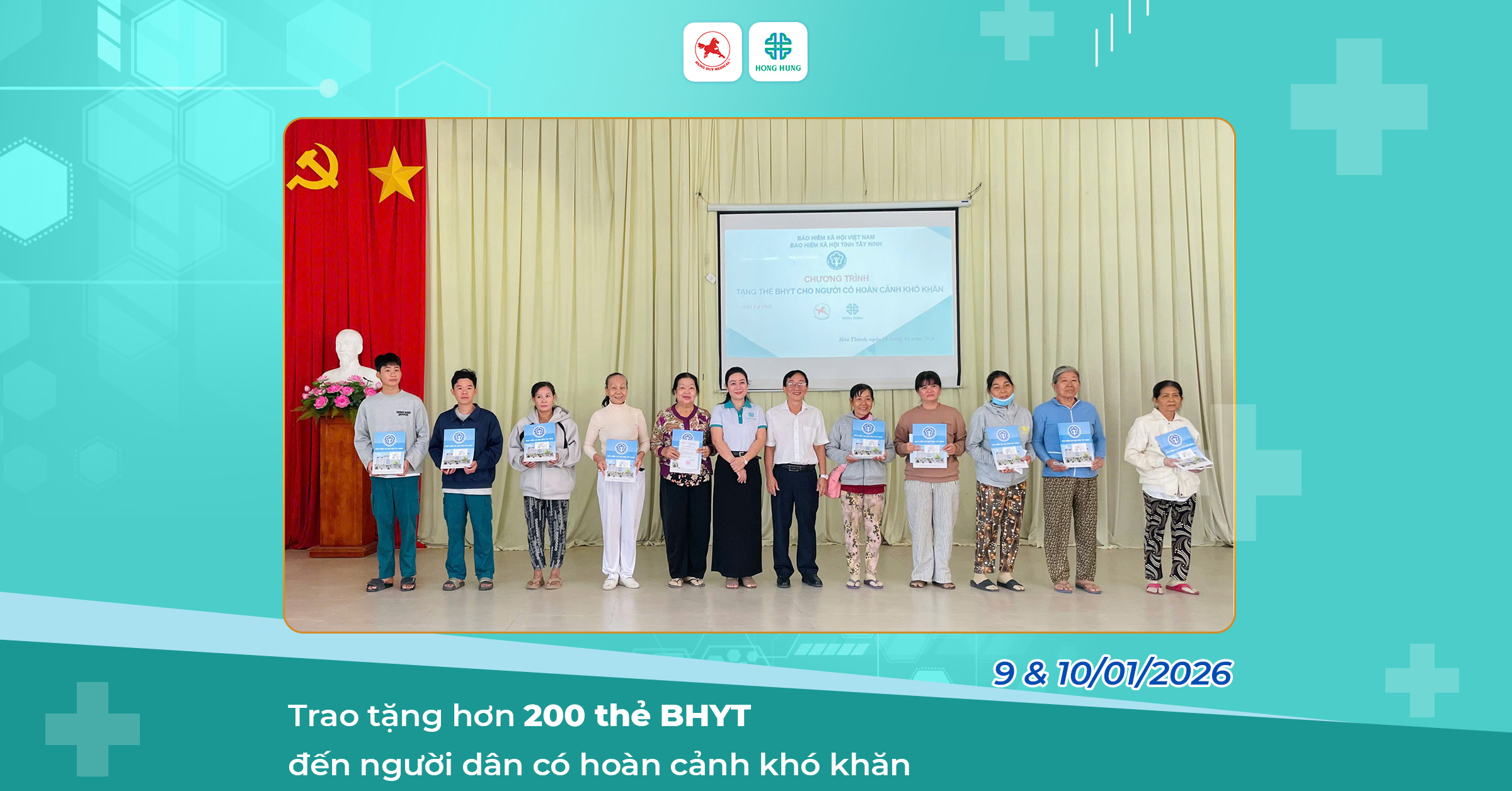 Trong hai ngày 09 và 10/01/2026 vừa qua, Bệnh viện Đa khoa Hồng Hưng đã tổ chức trao tặng 239 thẻ Bảo hiểm Y tế (BHYT) với thời hạn sử dụng 06 tháng đến người dân có hoàn cảnh khó khăn tại xã Hòa Hội, phường Thanh Điền, phường Long Hoa và phường Hòa Thành.