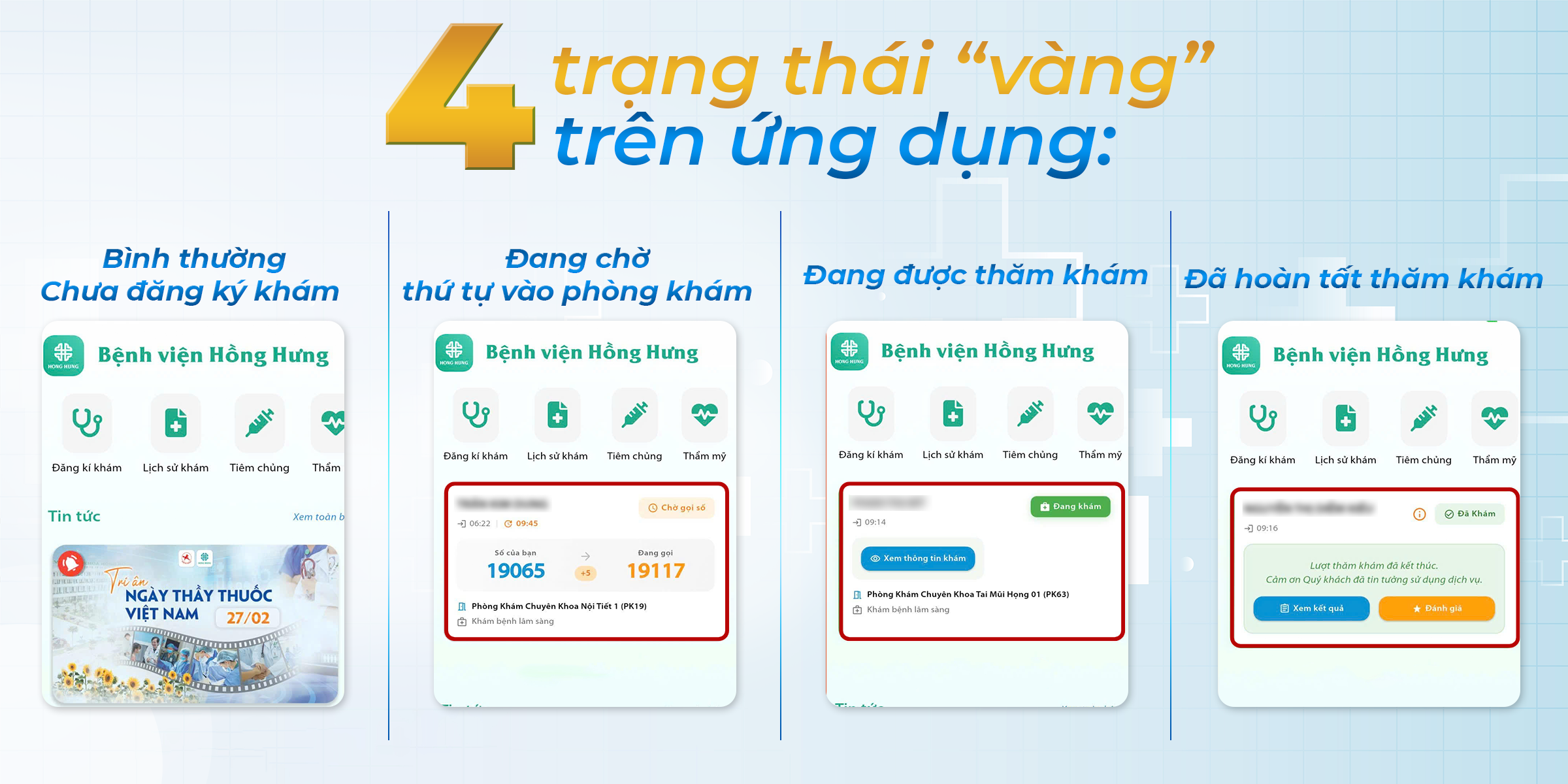 • Trạng thái 4 – Đã khám: Quy trình khám tại phòng bác sĩ đã hoàn tất, chuẩn bị cho các bước tiếp theo hoặc nhận toa thuốc.