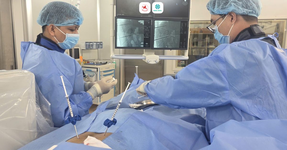 Để giải quyết tình trạng này, cụ L.T.S được chỉ định thực hiện kỹ thuật tạo hình thân đốt sống bằng xi măng sinh học dưới hướng dẫn của hệ thống DSA. Đây là phương pháp can thiệp ít xâm lấn, tiến hành qua đường kim nhỏ nhưng vẫn đảm bảo độ chính xác cao nhờ hình ảnh DSA thời gian thực.